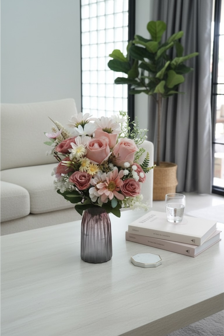 Bring the soft, refreshing spirit of nature into your home with this meticulously crafted artificial flower arrangement. Featuring soft peach roses, delicate daisies, and whimsical wildflowers nestled in a translucent purple glass vase, this set captures the essence of a fresh morning meadow. It’s the perfect accent to brighten up your desk, bookshelf, or dining table with a touch of everlasting charm.